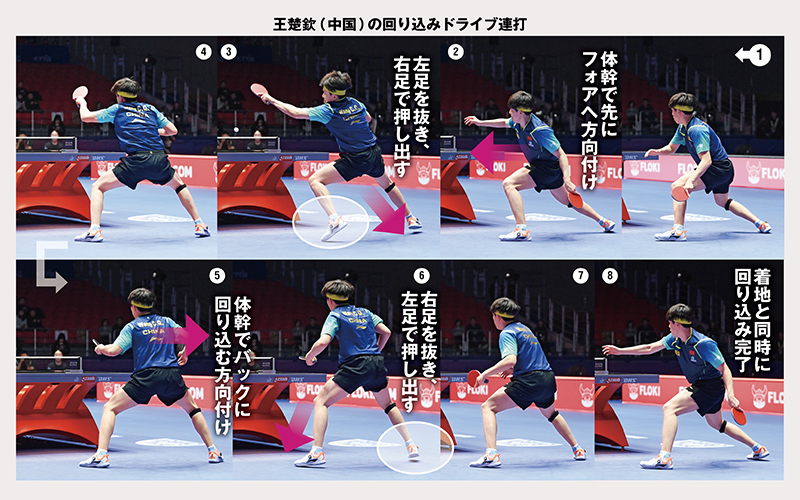 下連続写真は、王楚欽選手(中国)の抜重のフットワーク。①で回り込んだ後、予測よりもボールがフォア寄りに来たため、②でまずフォアサイドへ体幹の方向付け。続いて③で左足の支えを抜き、右足で押し出してフォアに動きながら、空中で打球しています。続いて⑤〜⑧でも抜重の動きで、着地と同時に回り込みが完了しています。