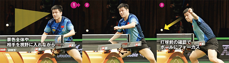 そして、重要なのは周辺視野と中心視野の「ズーム」の順番です。最初にボールにズーム(注視)してから周辺を見るという順番だと、運動のパフォーマンスが低下しやすいので、下写真の樊振東選手のように景色全体や相手を視野に入れながら、最後に確認のために短い時間で注視することがポイント。確認したらまた相手全体を視野に入れ、次球以降の展開に備えます。