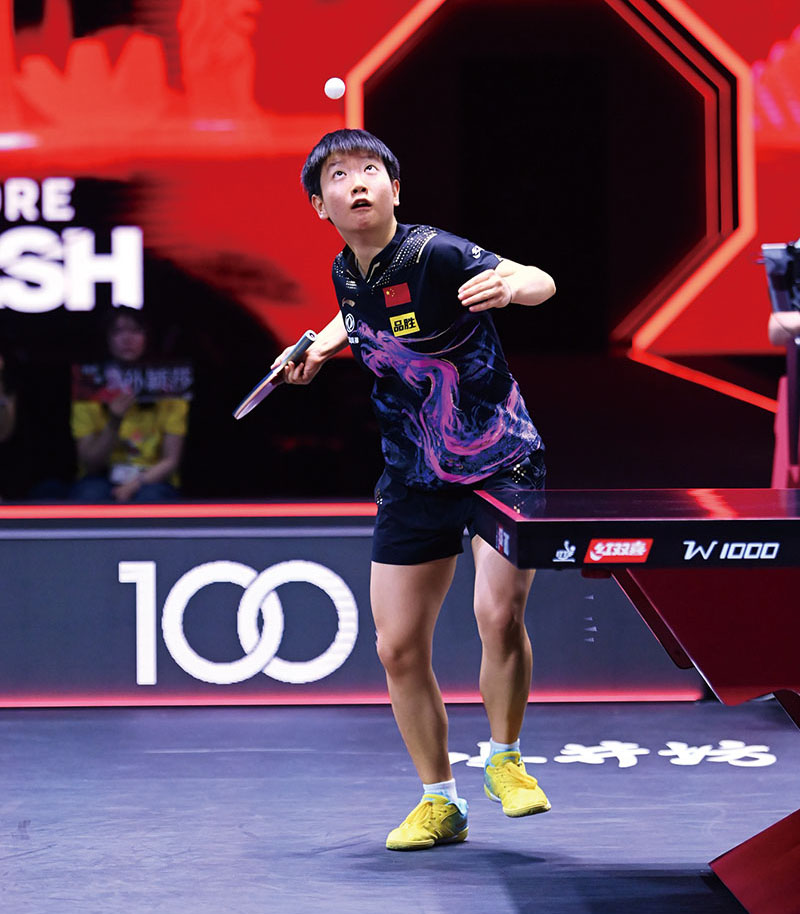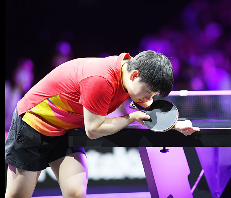 ❹~❼では、ラケットを上に振り上げるそのフェイクモーションから、スムーズに3球目攻撃の体勢に入っている。サービス自体の回転量は少なくても、強力な3球目攻撃と変化の読みにくさで相手にプレッシャーをかけ、相対的に威力を高めていくのが孫穎莎のスタイルだ。