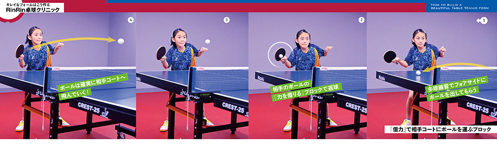 中国卓球には、相手のボールの威力を利用して返球するという意味の「借力(ジエリィ)」という言葉があります。きれいなフォアハンドの出発点であるブロックは、この「借力」の技術。まず多球練習で、フォアに少し強めのボールを送ってもらい、ミスなく何球でも相手コートに入るラケット面の角度を体に覚え込ませます。確実に相手コートにボールを入れる感覚を身につけることで、余計な力が入らない、キレイなフォームへとつながります。