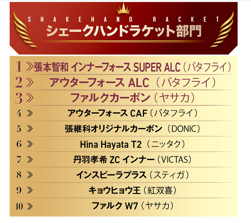 卓球王国PLUS > グッズ+ > ベストギア・オブ・ザ・イヤー【読者と専門店が選んだ ラバー&ラケット BEST 10】シェーク・ペンラケット