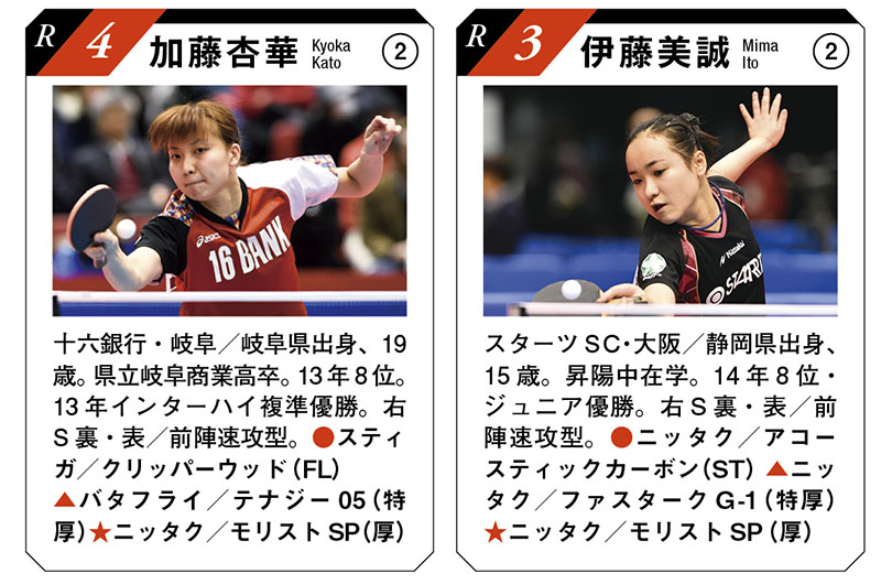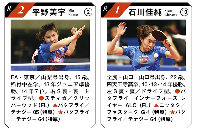 ※用具は全日本で使用したもの。試合名のない戦績は、全日本のもの(年は年度表記)。 ●ラケット(グリップ)▲フォア面(表面)ラバー (厚さ) ★バック面(裏面)ラバー(厚さ)※名前横の丸数字は、ランク入りの通算回数。EA=JOCエリートアカデミー
