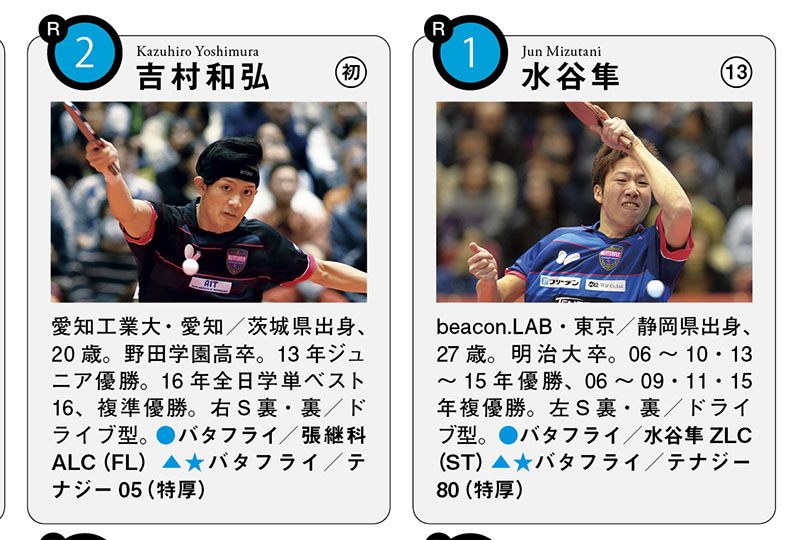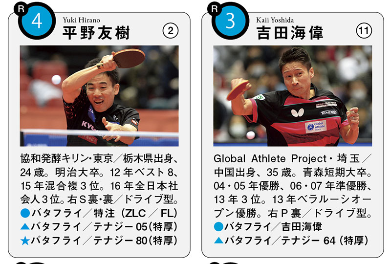 ※用具は全日本で使用したもの。試合名のない戦績は、全日本のもの(年は年度表記)。 ●ラケット(グリップ)▲フォア面(表面)ラバー (厚さ) ★バック面(裏面)ラバー(厚さ)※名前横の丸数字は、ランク入りの通算回数。EA=JOCエリートアカデミー