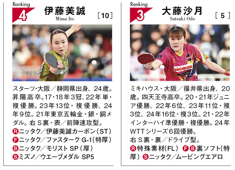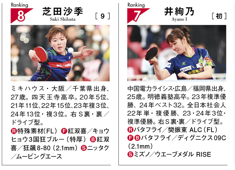 ※用具は全日本で使用したもの。試合名のない戦績は、全日本のもの(年は年度表記)。 ●ラケット(グリップ)▲フォア面(表面)ラバー (厚さ) ★バック面(裏面)ラバー(厚さ)※名前横の丸数字は、ランク入りの通算回数。EA=JOCエリートアカデミー