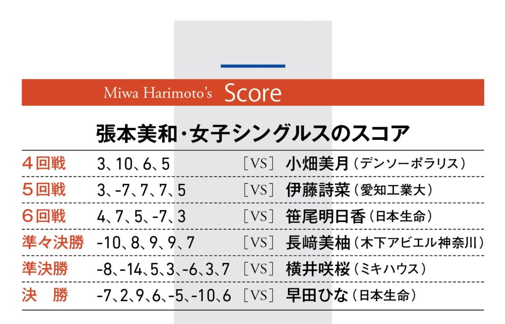1月20~25日の一般・ジュニアの部、1月29日~2月1日のダブルスの部と、2週間にわたって開催された今回の全日本は、まさに「張本美和の全日本」だった。出場可能な4種目すべてにエントリーし、そのすべてで優勝。4種目25試合を全勝で戦い抜き、これまで誰もなし得なかった4冠に輝いて、17歳の全日本を終えた。