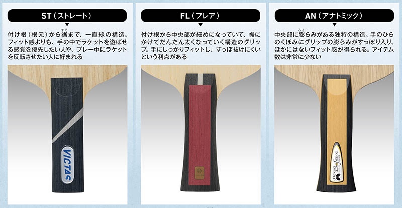 現在、シェークハンドラケットのグリップは、FL(フレア)が圧倒的多数の主流。FLしかグリップタイプのないラケットも多く存在する。かつてはFLとともに「二大グリップ」の一翼を担ったST(ストレート)は、使用者もアイテム数も減少傾向にある。AN(アナトミック)はさらに少なく、バタフライをはじめとした数メーカーに少しだけラインナップが残っている程度だ。