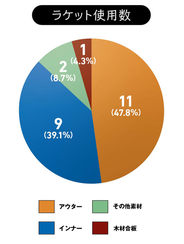 男子23名の戦型は、23名中21名がシェークドライブ型という結果に。残りはペンドライブ型1名、シェーク異質攻撃型1名となった。ラケットはアウターの人気が高まり、昨年は過半数を占めていたインナーを上回った。より早いタイミングで、より強いボールを相手コートに打ち込みたいという志向によるものだろう。