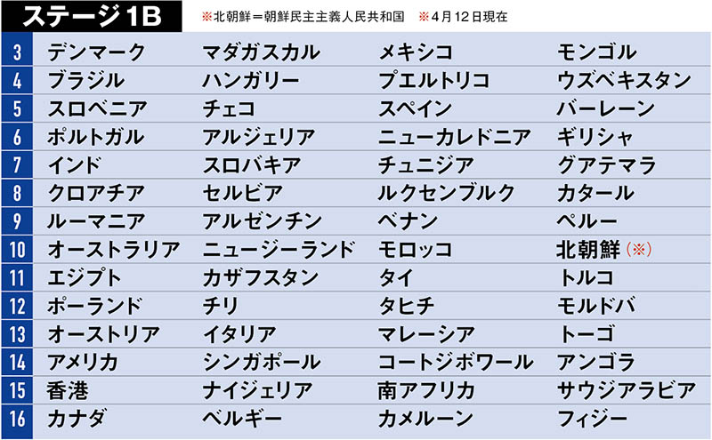 まず大会序盤の4月28日〜5月1日は、出場する全64チームのうち56チームがグループ3〜16に分かれ、「ステージ1B」(組み合わせは下参照)を実施。各グループの1位チームと、2位の14チーム中10チームが決勝トーナメントに進出する。
