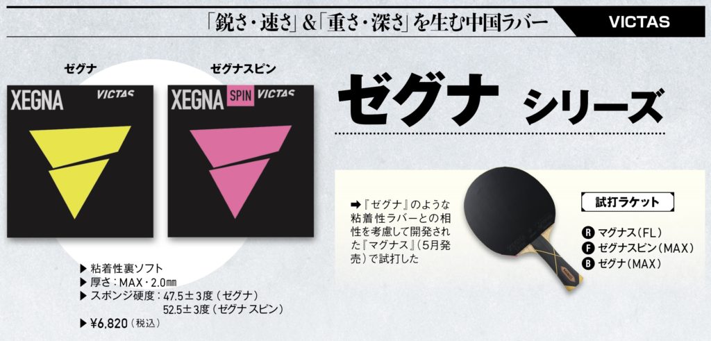 今回は、第2弾として『ゼグナ』&『ゼグナスピン』(VICTAS)の試打レビューをお届けしよう。